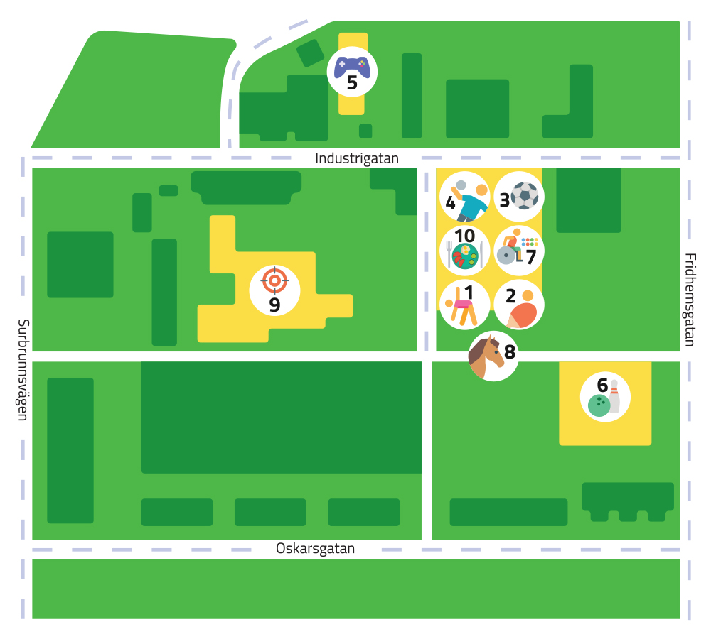Det kommer att stå ett gult informationstält i mitten av området, i närheten av den svarta vattenrutschkanan.